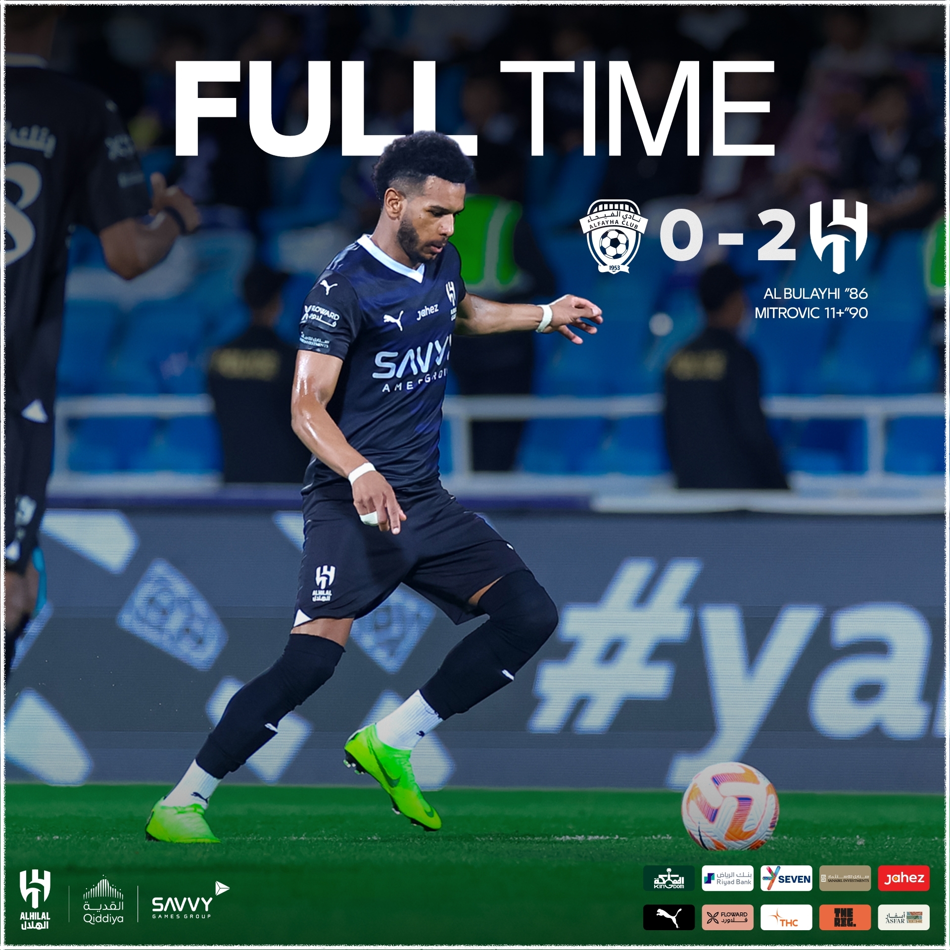 全场比赛结束,利雅得新月2-0击败费哈。