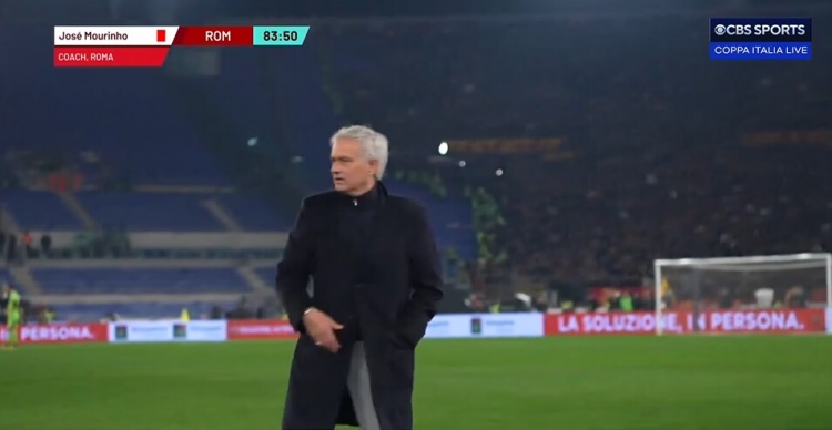 第84分钟,主裁判向罗马替补席出示红牌,字幕显示是穆里尼奥,但实际不是。此后穆帅也一直在场边↓
