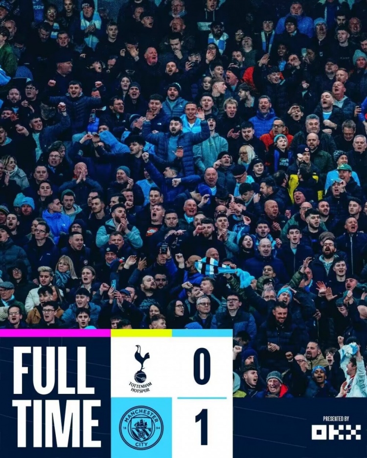 下半场补时5分钟。最终全场比赛结束,曼城1-0热刺。