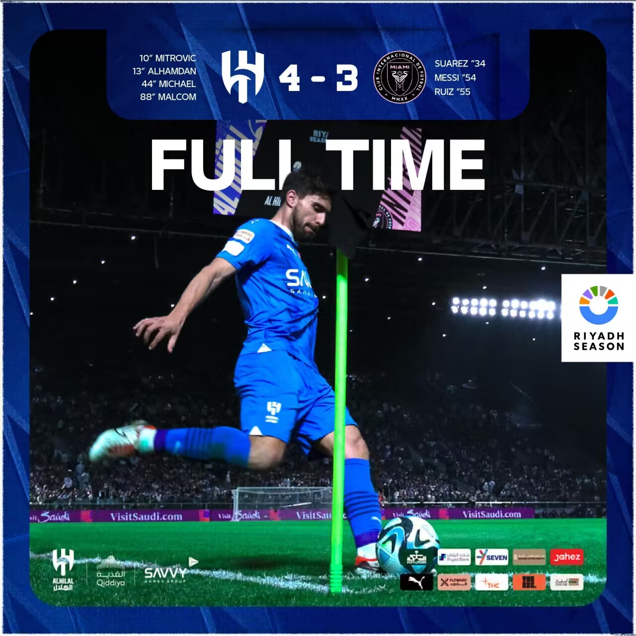 1月30日讯 北京时间1月30日02:00,足球友谊赛迈阿密国际挑战利雅得新月的比赛,上半场米特洛维奇、哈姆丹双双破门,苏亚雷斯首球,布斯克茨失良机,梅西进球被吹,迈克尔头球建功,半场结束,利雅得新月3-1迈阿密国际。下半场鲁伊斯造点后抽射破门,梅西点射收获年度首球+献助攻,马尔科姆头球绝杀,最终迈阿密国际3比4利雅得新月。