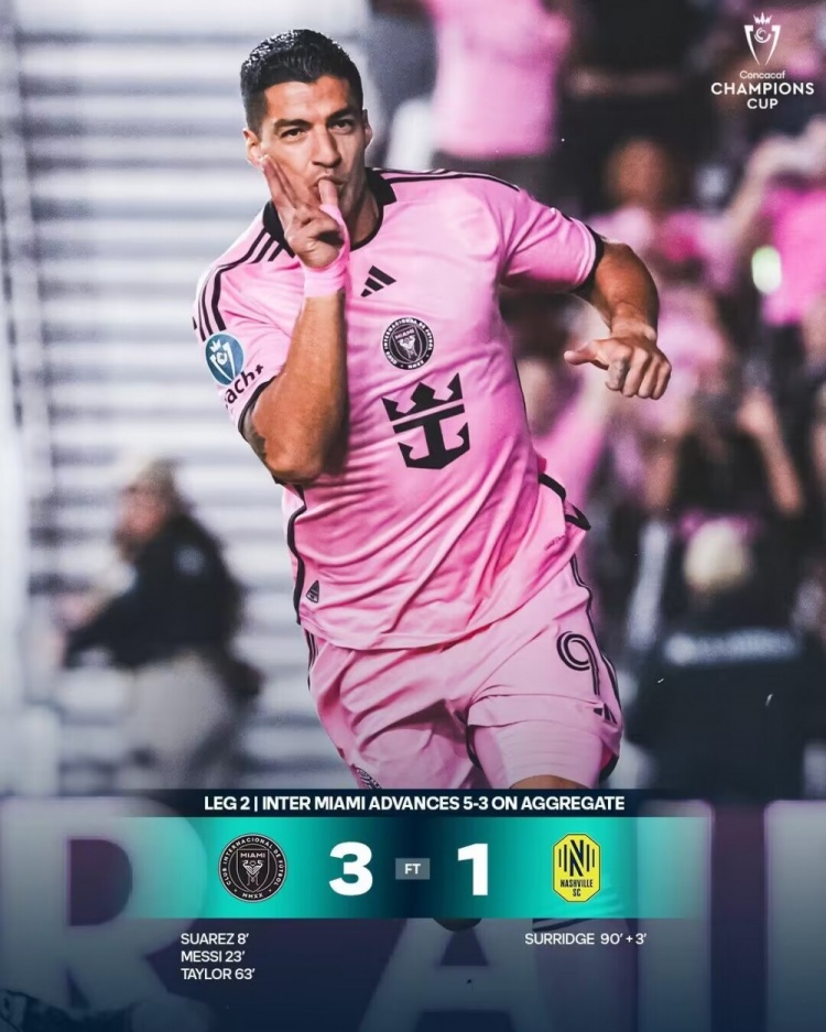 3月14日讯 北京时间3月14日08:15,美冠杯十六强次回合迈阿密国际迎战纳什维尔的比赛,双方首回合迈阿密国际客场2-2纳什维尔,上半场梅西助攻苏亚雷斯先下一城,随后梅西抽射破门,半场结束,迈阿密国际2-0纳什维尔。下半场梅西第49分钟被换下,苏亚雷斯助攻泰勒头球建功,苏里奇补时扳回一城,最终迈阿密国际3-1纳什维尔总比分5-3晋级八强。