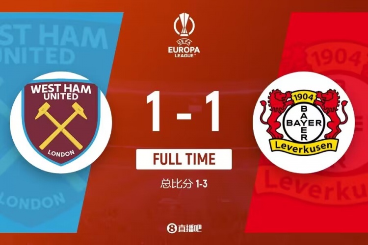 4月19日讯 欧联杯1/4决赛次回合,勒沃库森客场vs西汉姆联。首回合比赛勒沃库森2-0获胜。上半场,鲍文助攻安东尼奥破门;鲍文近距离射门险些扳平总比分。下半场弗林蓬失单刀后89分钟绝平!最终,勒沃库森1-1战平西汉姆联,总比分3-1晋级欧联4强!延续不败纪录!本赛季至今连续44场不败!