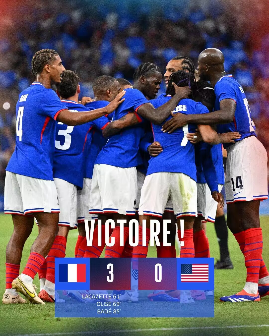 7月25日讯 北京时间7月25日03:00,奥运男足小组赛A组首轮法国迎战美国的比赛,上半场阿伦森内切劲射造险,双方均无建树,下半场米哈伊洛维奇远射中楣,奥利塞助攻拉卡泽特贴地斩破门,雷斯特献精彩扑救,随后拉卡泽特助攻奥利塞兜射破门,巴代头球破门扩大比分,最终法国国奥3-0美国国奥取得开门红。