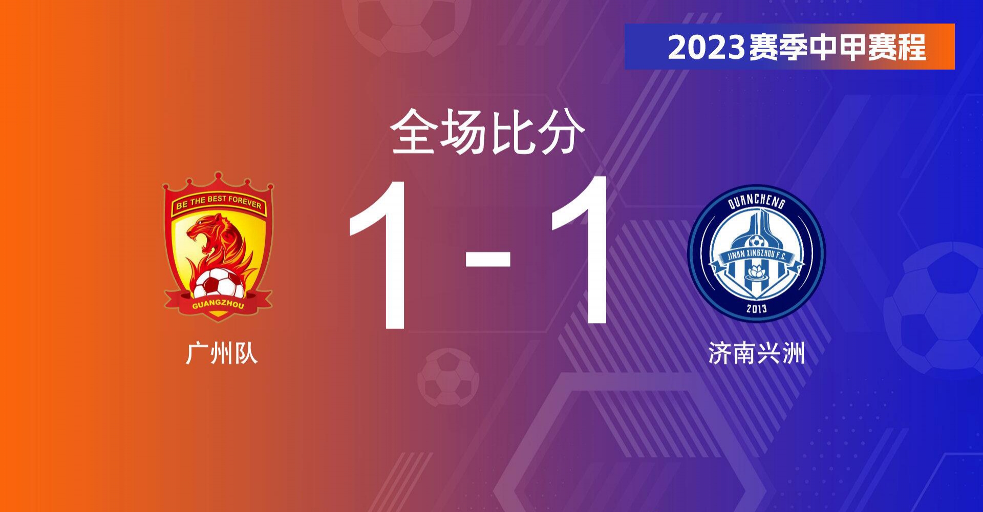 下半场补时10分钟。最终全场比赛结束,广州队主场1-1济南兴洲。
