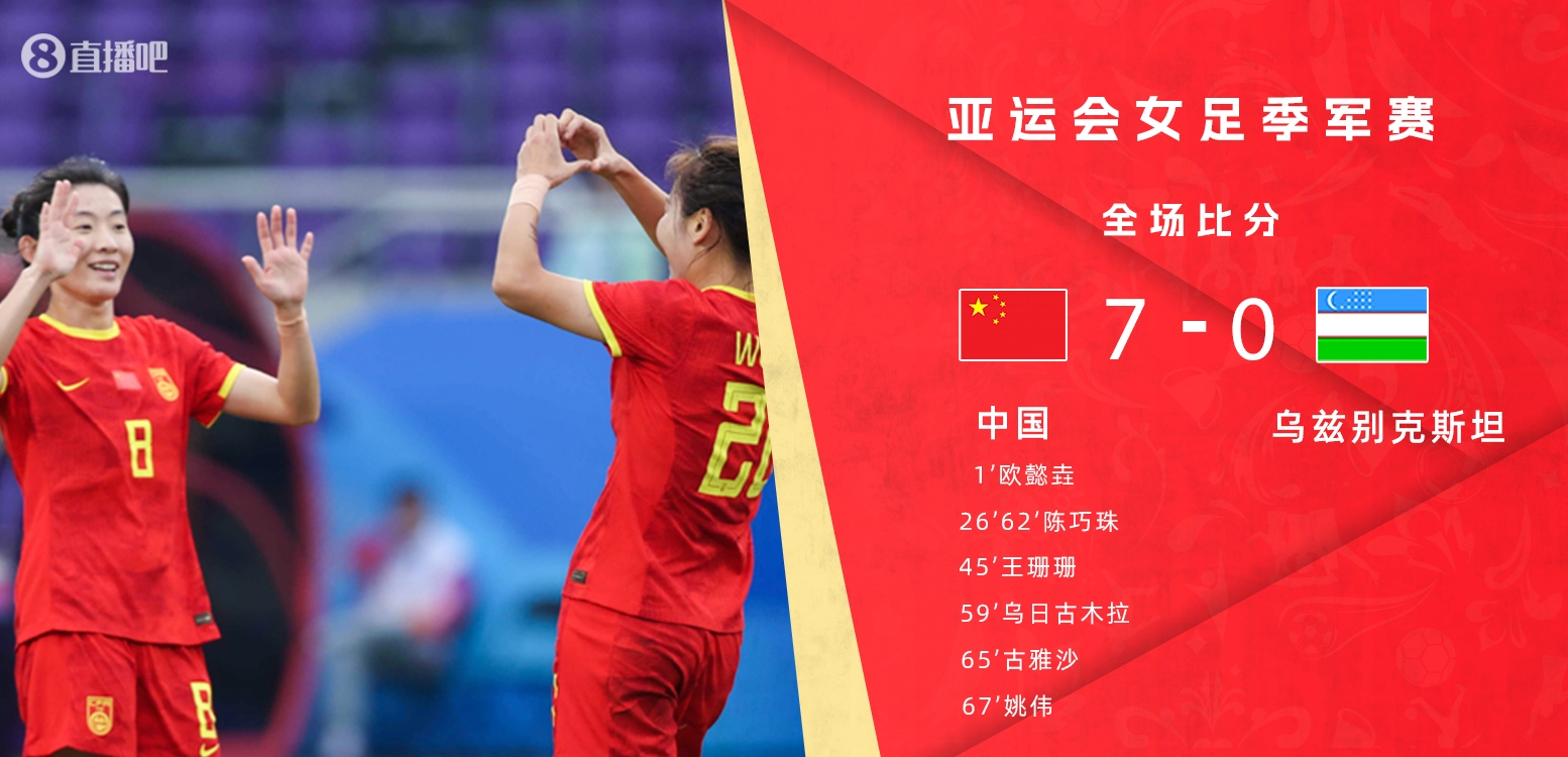 最终,中国女足7-0乌兹别克斯坦女足。